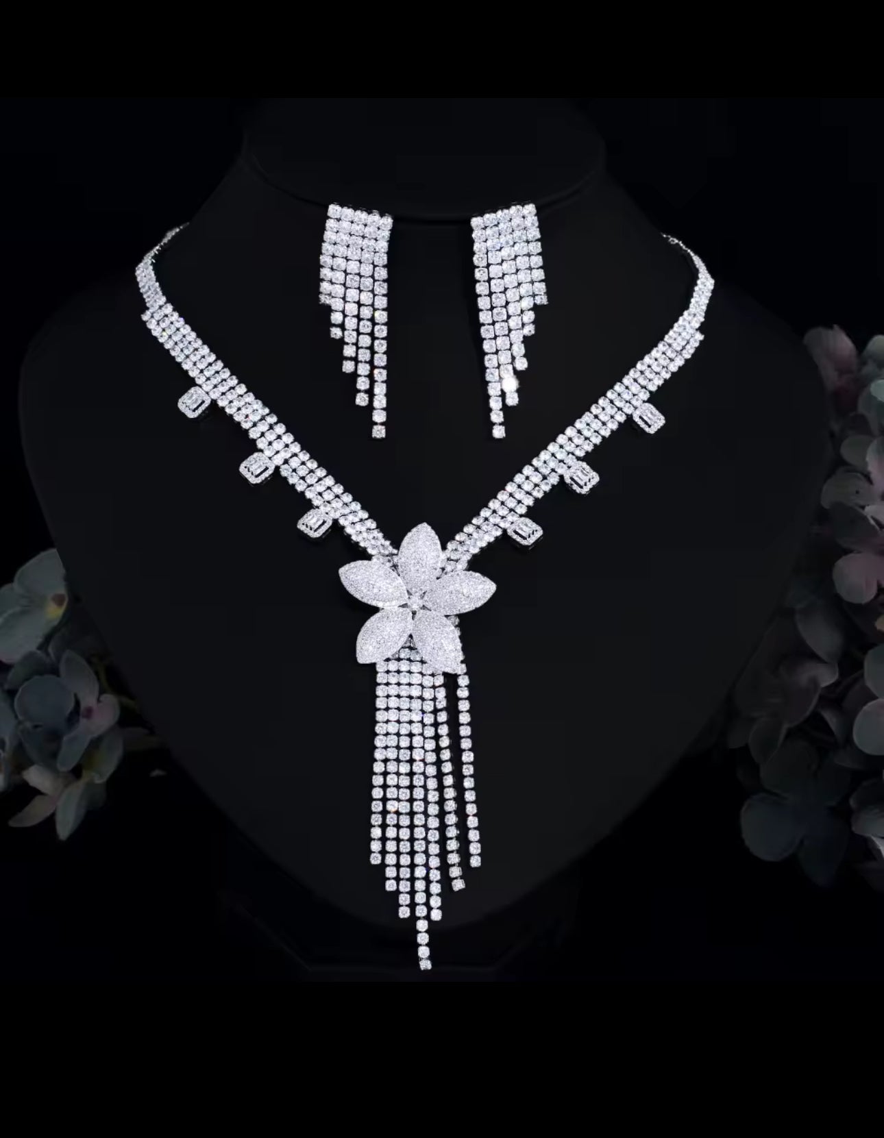 這款立方鋯石銅制新娘飾品組合以優雅的大花造型呈現浪漫奢華,鑲嵌閃亮的立方鋯石,散發璀璨光芒。套裝設計讓您無需煩惱配搭,一次擁有完整的婚禮飾品,完美適合婚宴、晚裝等重要場合,讓您成為全場焦點。