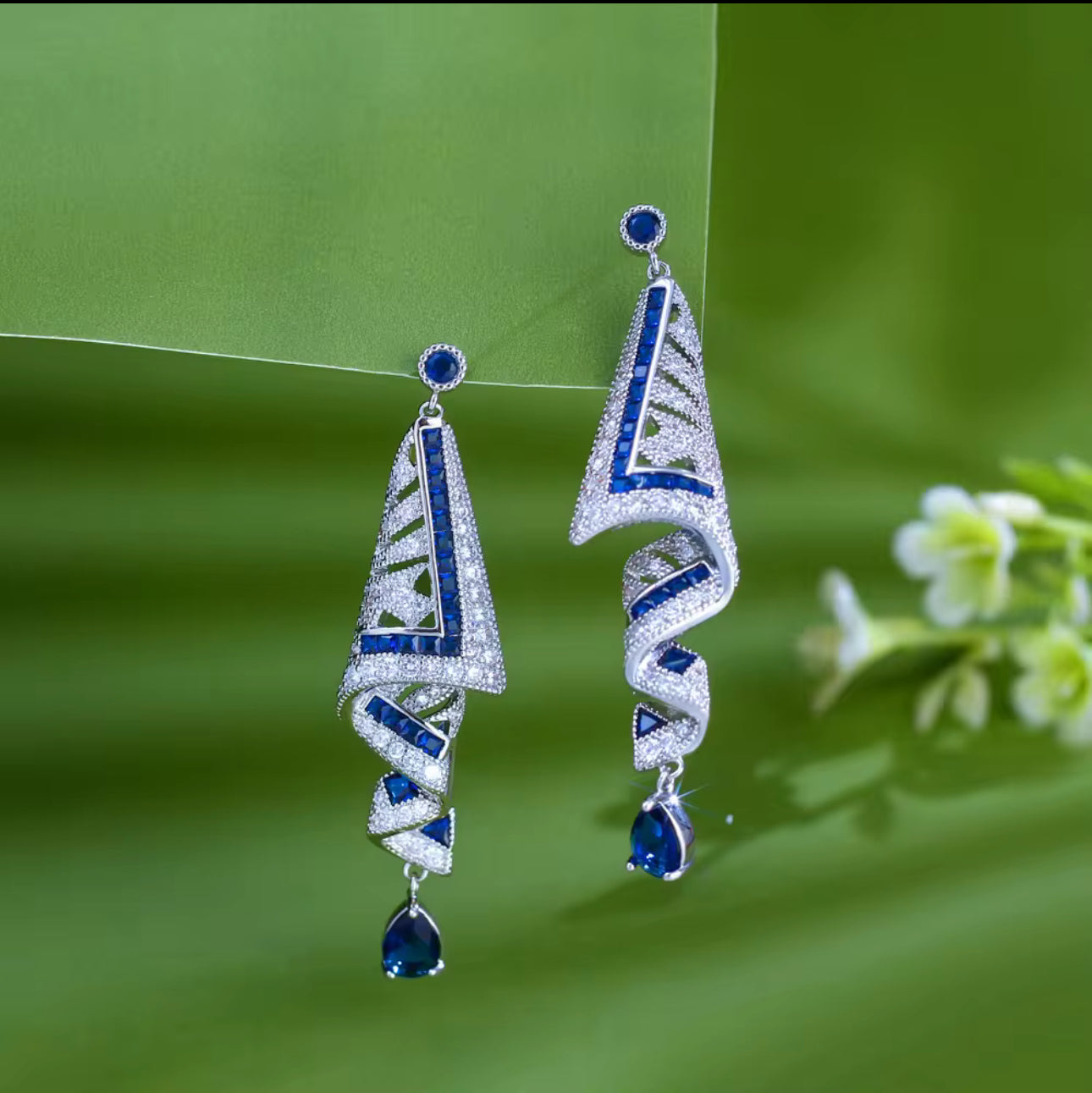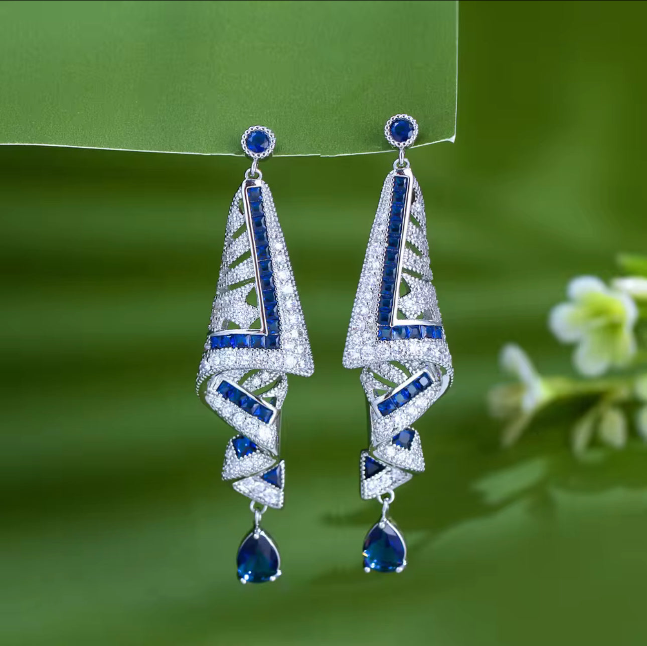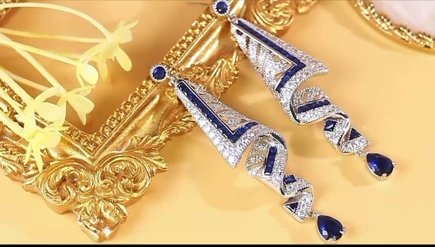 藍色立方氧化鋯長耳環 - 奢華婚禮派對垂墜款