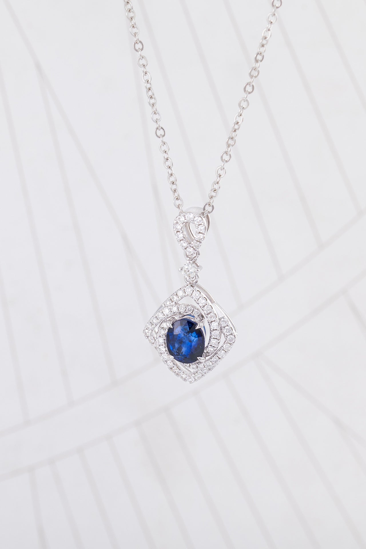 這款優雅的藍寶石吊墜展現了寶石的自然魅力與精湛工藝。主石採用 0.993 克拉天然藍寶石,色澤深邃迷人,周圍環繞著 0.281 克拉閃耀鑽石,營造出奢華而精緻的視覺效果。